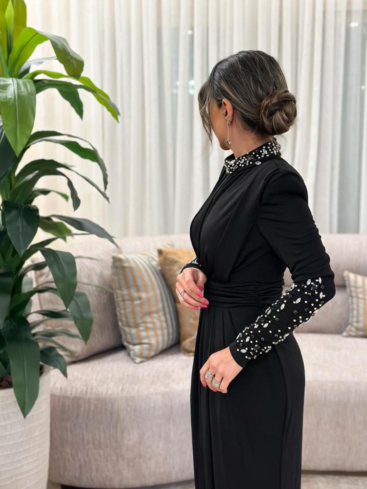 فستان اسود بتطريز على الاكمام